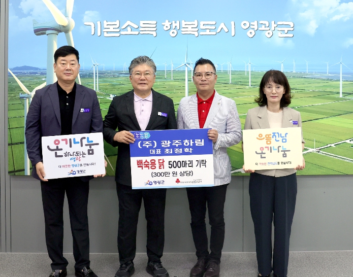 [뉴스노크=김인호 기자] 영광군은 지난 16일 (주)광주하림(대표 최정학)에서 무더위에 취약한 어르신들의 건강한 여름나기를 위한 백숙용 국내산 생닭 500마리(300만 원 상당) 기탁했다고 밝혔다.