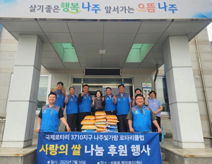 나주시(시장 윤병태)는 빛가람로타리클럽이 성북동 저소득 가정을 위해 사용해달라며 창립 10주년 기념 및 회장 이취임식에서 받은 백미 310kg을 기탁했다고 17일 밝혔다.