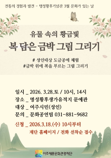 [뉴스노크=김인호 기자] 여주세종문화관광재단은 오는 3월 28일, 명성황후기념관 3월 문화가있는 날 프로그램으로 '유물 속의 황금빛, 복 담은 금박 그림 그리기'를 진행한다.