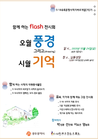 [뉴스노크=김인호 기자] 광주광역시는 5·18민주유공자유족회와 함께 24일 동구 남동5·18기념성당에서 시민과 함께하는 ‘오월 풍경 그리고(drawing) 시월 기억’ 전시회를 개최한다.