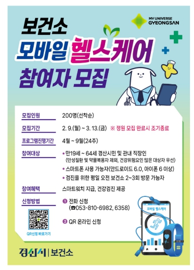 [뉴스노크=김인호 기자] 경산시는 ICT 기술을 활용해 시민의 생활 습관을 개선하는‘2026년 모바일 헬스케어 사업’ 참여자 200명을 오는 9일부터 모집한다고 밝혔다.
