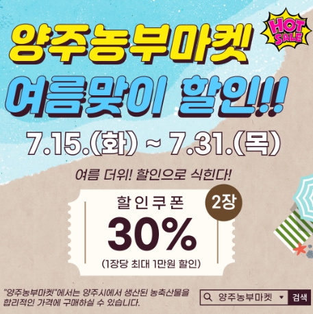 이번 행사는 본격적인 무더위가 시작되는 시기에 맞춰, 시민들이 신선한 지역 농축산물을 보다 실속있게 즐길 수 있도록 기획됐으며, 행사기간 중 양주농부마켓에 로그인만하면 30% 할인쿠폰 2장을 지급받을 수 있어, 누구나 손쉽게 혜택을 누릴 수 있다.