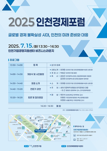 [뉴스노크=김인호 기자] 인천연구원은 2025년 7월 15일 오후 2시, 인천기업경영지원센터 비즈니스라운지(인천시 연수구 미추홀타워 3층)에서 “글로벌 경제 불확실성 시대, 인천의 미래 준비와 대응”이라는 주제로 '2025년 인천경제포럼'을 개최한다.