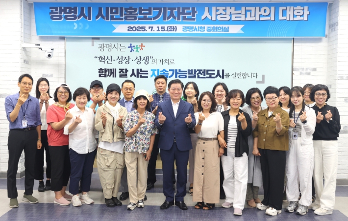 ▲ 박승원 광명시장(앞줄 왼쪽 여섯 번째)이 15일 시청 중회의실에서 열린 ‘2025 광명시 홍보서포터즈 워크숍’에 참석해 시민홍보기자단과 기념사진을 촬영하고 있다. |