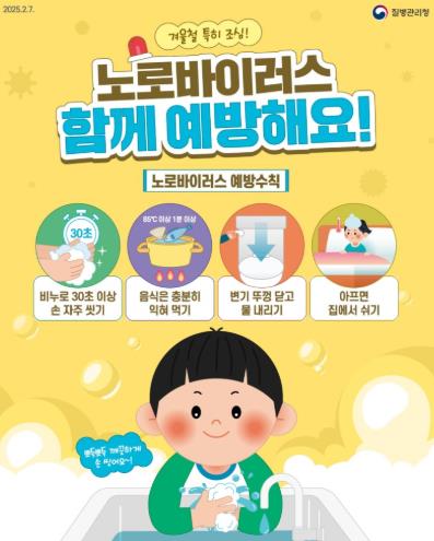 아울러 환자 발생 시에는 ▲증상 소실 후 48시간이 경과할 때까지 등원·등교·출근 제한 ▲배변 후 변기 뚜껑을 닫고 물 내리기 ▲구토물 및 접촉환경, 사용 물품 등에 염소 소독(락스1:물39)실시 등 감염 확산 방지를 위한 조치를 반드시 이행해야 한다.
