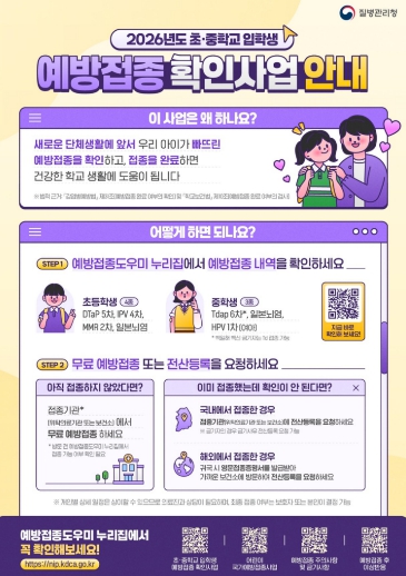 평택시 송탄보건소 관계자는 “초·중학교 입학생은 단체생활로 감염병 확산에 취약한 만큼 입학 전 예방접종 기록을 확인하고 필요한 접종을 완료해 안전한 학교생활을 시작하길 바란다”라고 전했다.