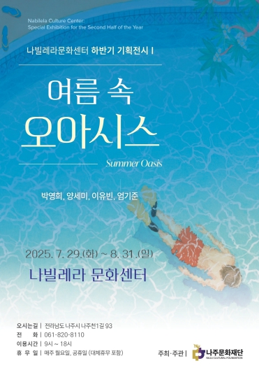 [뉴스노크=김인호 기자] 나주문화재단이 오는 7월 29일부터 8월 31일까지 나빌레라문화센터에서 하반기 첫 번째 기획전시 ‘여름 속 오아시스’를 개최하고 무더운 여름철 시민들에게 감각적 예술과 함께하는 특별한 휴식을 선사한다.