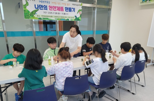[뉴스노크=김인호 기자] 전남 무안군 드림스타트는 여름방학을 맞아 지난 21일부터 2주간 월요일에는 무안군 복합문화센터에서, 수요일은 남악회룡주공아파트 ‘아낌없이 주는 작은도서관’ 프로그램실에서 총 4회에 걸쳐 나만의 천연제품 만들기 프로그램을 운영했다.