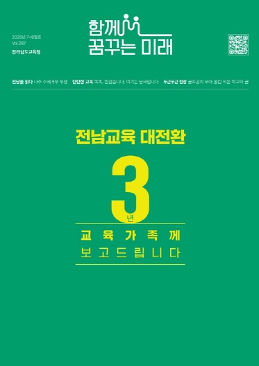 [뉴스노크=김인호 기자] 전라남도교육청 소식지 '함께 꿈꾸는 미래' 2025년 7+8월호가 나왔다. 이번 호는 주민직선 4기 출범 3주년을 맞아 전남 교육현장에서 싹튼 혁신의 장면들을 취재해 실었다. 학령 인구 감소, 작은학교 및 이주배경 학생 증가 등 전남교육이 직면한 위기를 기회로 활용하고 있는 ‘전남교육 대전환’의 모습을 기사에서 엿볼 수 있다.