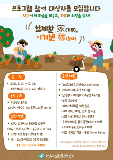 [뉴스노크=김인호 기자] 고양특례시 일산동구보건소는 지역 내 재가암환자와 돌봄가족을 대상으로 한 치유농업 기반 건강증진 프로그램 ‘함께할 家(가), 이겨낼 稼(가)’에 참여할 하반기 대상자를 오는 21일부터 모집한다.