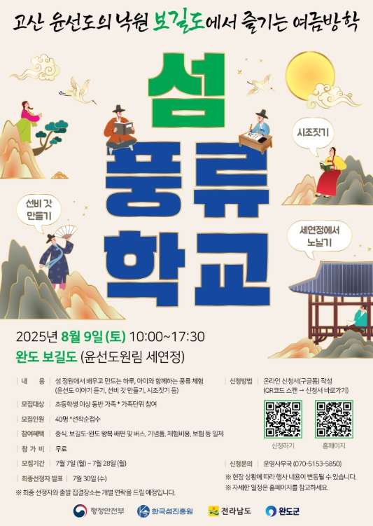 섬 풍류학교는 8월 9일 보길도 윤선도원림 세연정에서 펼쳐진다.