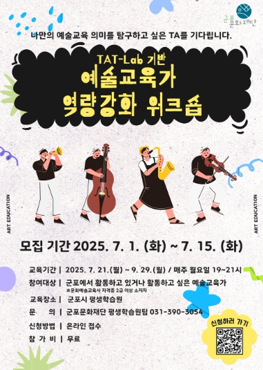 군포문화재단 전형주 대표이사는 “군포시평생학습원을 거점으로 지역의 예술교육가들이 협력적이고 실험적인 학습 환경을 경험하고, 워크숍 등 프로그램을 통해 예술교육의 의미를 탐구하며 이를 지역사회와 함께 나누는 기회가 되길 바란다”고 말했다.