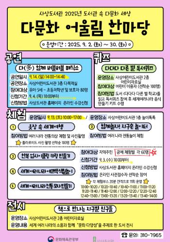 사상도서관은 9월 한 달 동안 문화 다양성을 주제로 공연, 체험, 전시 등 다양한 행사를 마련한다.