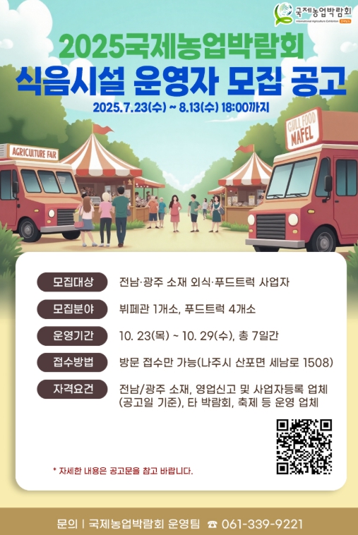 [뉴스노크=김인호 기자] (재)전라남도국제농업박람회는 2025 국제농업박람회 식음시설 운영자를 오는 13일까지 3주간 모집한다고 밝혔다.