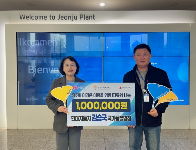 [뉴스노크=김인호 기자] 현대자동차 전주공장 김승국 국가품질명장은 16일 전주시복지재단에 어려운 이웃을 위한 성금 100만 원을 기탁했다.
