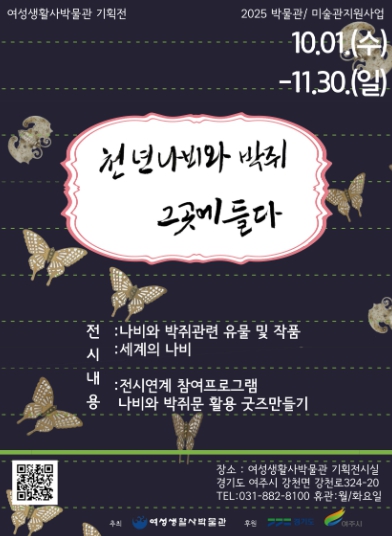 [뉴스노크=김인호 기자] 여주시에서 진행하는 2025년 박물관·미술관 지원사업의 일환으로 여성생활사박물관의 ‘천년 나비와 박쥐 그곳에 들다’ 전시가 10월 1일부터 11월 30일까지 개최된다.