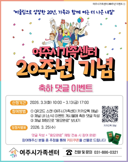 이번 이벤트는 여주시가족센터 카카오톡 채널을 통해 참여할 수 있다. 센터 개소 20주년을 축하하는 메시지를 댓글로 남기면 추첨을 통해 소정의 선물을 제공하며, 여주시민이라면 누구나 참여 가능하다.