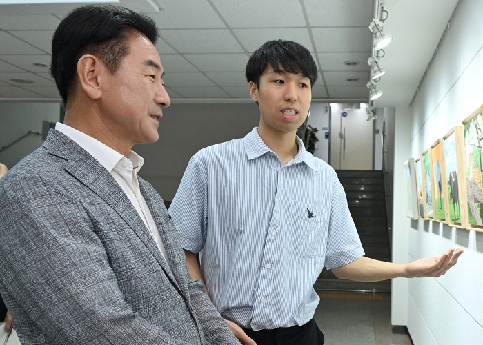 ▲ 김동근 시장이 9월 1일 ‘멸종위기 동물 그림 전시회’가 진행 중인 시청 시민갤러리에서 강석준 화가에게 작품 설명을 듣고 있다. |