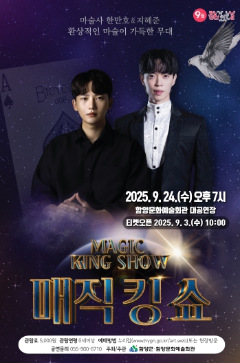 [뉴스노크=김인호 기자] 함양문화예술회관은 9월 문화가 있는 날을 맞아 오는 9월 24일 오후 7시, 대공연장에서 ‘한만호 & 지혜준 매직킹 쇼’를 개최한다고 밝혔다.