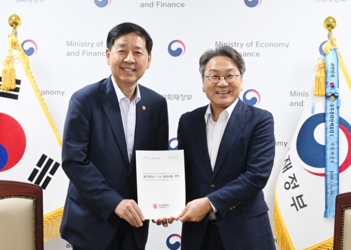 ▲ 강기정 광주광역시장이 5일 정부서울청사에서 구윤철 경제부총리 겸 기획재정부 장관에게 내년도 광주시 주요 현안사업을 건의한 뒤 기념촬영을 하고 있다. /광주광역시 제공 |