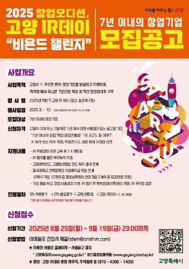 [뉴스노크=김인호 기자] 고양특례시는 우수한 창업·벤처기업을 발굴하기 위해 창업가와 투자자와의 만남의 장인 ‘2025 창업오디션,고양아이알(IR)데이 비욘드 챌린지’에 참여할 창업기업을 모집한다고 밝혔다.