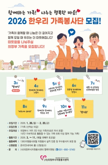 [뉴스노크=김인호 기자] 의정부시자원봉사센터는 지난 1월 26일부터 의정부시 가족 단위 자원봉사 활성화를 위해 2026년 신규 ‘한우리 가족봉사단’ 모집을 시작했다.