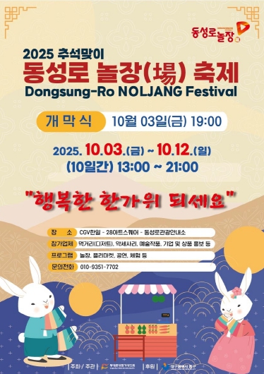 [뉴스노크=김인호 기자] 대구 중구는 10월 3일부터 12일까지 10일간 동성로 보행자전용도로 일원에서 ‘동성로에서 놀며 장보자!’라는 테마로 ‘2025 추석맞이 동성로 놀장(場) 축제’를 개최한다.