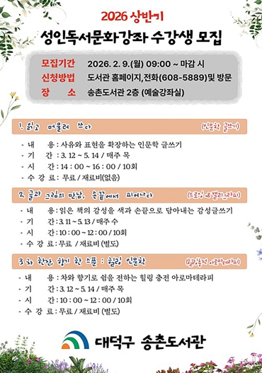 [뉴스노크=김인호 기자] 대전 대덕구 송촌도서관은 새봄을 맞아 오는 3월부터 성인을 대상으로 한 독서문화강좌를 운영한다.