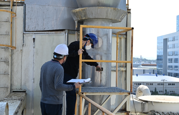 | ▲ 대덕구 직원이 악취배출시설에서 악취 발생 실태 파악과 배출 기준 준수 여부 확인을 위해 시료를 포집하고 있다. |