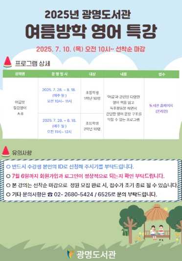 ▲ 2025년 광명도서관 여름방학 영어 특강 모집 안내문. |