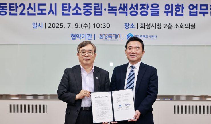 [뉴스노크=김인호 기자] 화성특례시와 경기주택도시공사(GH)가 9일 '동탄2신도시 탄소중립·녹색성장을 위한 업무협약'을 체결했다.