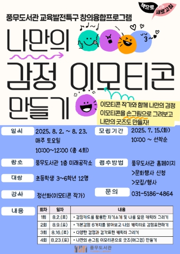 [뉴스노크=김인호 기자] 김포시 풍무도서관은 교육발전특구 사업의 일환으로 오는 8월 2일부터 23일까지 총 4회에 걸쳐 매주 토요일 오전 10시부터 12시까지 ‘나만의 감정 이모티콘 만들기’ 프로그램을 운영한다.