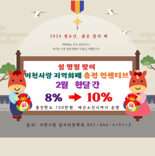 [뉴스노크=김인호 기자] 이천시는 설 명절을 맞아 지역경제 활성화와 소상공인 매출 증대를 위해 2026년 2월 한 달간 이천사랑지역화폐 충전 인센티브를 기존 8%에서 10%로 상향한다고 밝혔다.
