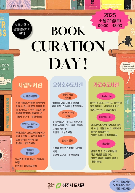 [뉴스노크=김인호 기자] 청주시립도서관은 청주대학교 문헌정보학과(지도교수 김혜영)와 함께 오는 22일 오전 9시부터 오후 6시까지 △시립도서관 △오창호수도서관 △가로수도서관 등 3개 도서관에서 ‘북큐레이션 데이’를 동시에 개최한다고 밝혔다.
