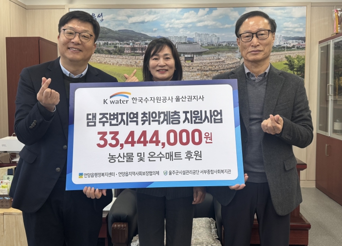 [뉴스노크=김인호 기자] 울주군시설관리공단 서부종합사회복지관(이사장 최인식)은 12월 8일, 한국수자원공사 울산권지사와 함께 ‘물길따라 온기 전하는 겨울나기 지원사업’을 추진해 댐 주변지역 취약계층 233세대에 온수매트와 농산물 꾸러미를 지원했다.