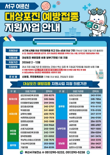 [뉴스노크=김인호 기자] 부산 서구는 올해 65세 이상 어르신들을 대상으로 대상포진을 예방하고 노년기 삶의 질 향상을 도모하고자 대상포진 예방접종 지원사업을 오는 2월부터 서구 관내에 첫 도입한다.