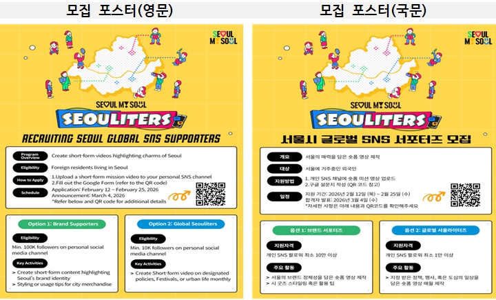 [뉴스노크=김인호 기자] 서울시는 서울의 다양한 모습을 외국인 시각으로 소개하는 2026년 글로벌 SNS 서포터즈 ‘서울라이터즈(Seouliters)’ 3기를 2월 12일부터 25일까지 모집한다고 밝혔다.