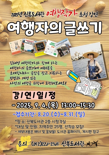 [뉴스노크=김인호 기자] 울산 남구 신복도서관은 9월 4일 오후 1시 신복도서관 2층 시청각실에서 김혜영 작가와 함께하는 ‘여행자의 글쓰기’ 강연을 개최한다.