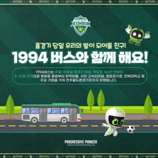 김용삼 전주시 대중교통국장은 “주차 문제로 고민하는 팬들의 마음을 잘 알고 있으며, 전주시가 준비한 1994 특별노선을 이용하면 주차 스트레스 없이 오직 경기에만 집중하실 수 있을 것”이라며 “이번 슈퍼컵이 전주시의 선진적인 교통 행정과 성숙한 응원 문화를 전국에 알리는 계기가 되도록 운영에 만전을 기하겠다”고 말했다.