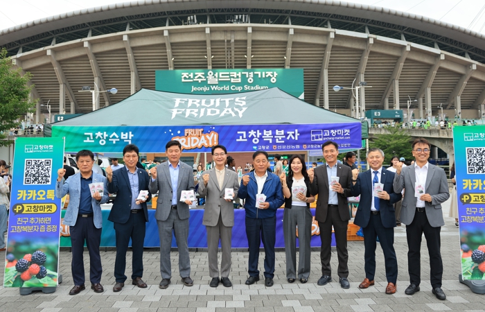 [뉴스노크=김인호 기자] 고창군이 전북현대모터스축구단과 손잡고 복분자와 수박 등 농특산품 홍보 행사를 열었다.