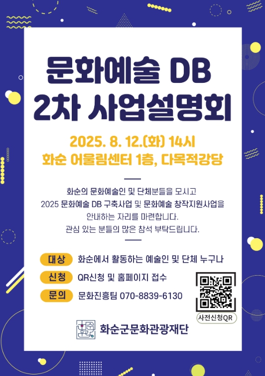 [뉴스노크=김인호 기자] (재)화순군문화관광재단은 8월 12일 오후 2시 화순 어울림센터 다목적강당에서 ‘2025 문화예술인 DB 구축 2차 사업설명회’를 개최한다고 밝혔다.