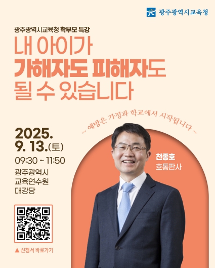 [뉴스노크=김인호 기자] 광주시교육청은 오는 9월 13일 오전 9시30분 광주시교육청연수원 대강당에서 학부모를 대상으로 천종호 부산지방법원 부장판사 초청 특강을 진행한다.