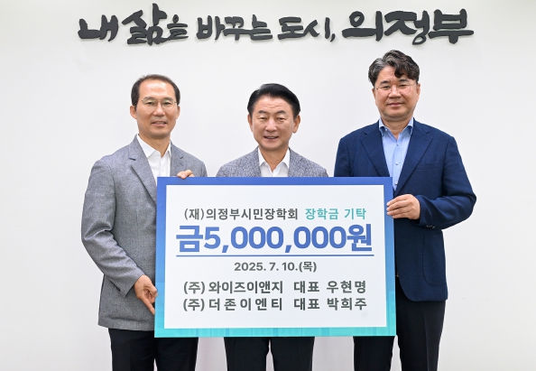 [뉴스노크=김인호 기자] 의정부시는 7월 10일 ㈜와이즈이앤지와 ㈜더존이엔티가 총 500만 원의 장학금을 의정부시민장학회에 기탁했다고 밝혔다.