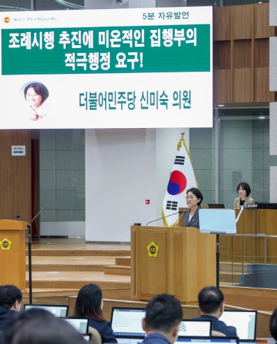 신 의원은 “지난 2월, 전국 최초로 출범한 '조례시행추진관리단'은 그간 244건의 조례를 점검했고 이 중 시행이 미진한 9건은 소관 부서의 의견을 청취하고자 별도 회의를 갖기도 했다”며 “이 과정에서 일부 부서의 책임감없고 소극적인 태도로 임한 점이 매우 유감스럽다”고 언급했다.