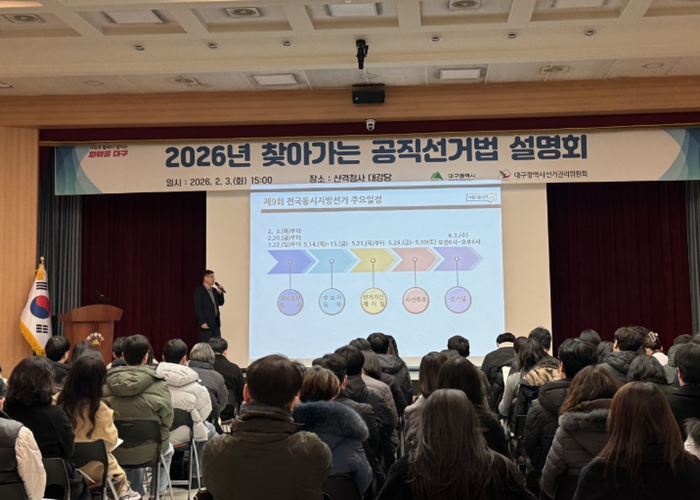 [뉴스노크=김인호 기자] 대구광역시는 6월 3일 실시되는 ‘제9회 전국동시지방선거’를 앞두고 공무원의 정치적 중립을 다짐하고 공직선거법 이해도를 높이기 위해, 2월 3일 시청 산격청사에서 ‘찾아가는 공직선거법 설명회’를 개최했다.