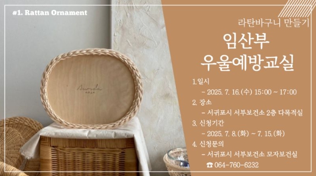 이번 우울예방교실은 라탄바구니 만들기를 하여 손작업을 통해 임산부의 마음의 안정을 도모하고 태아와의 유대감을 형성할 수 있도록 구성됐으며 참여 대상은 대정·안덕에 거주하는 임산부이며 7월 8일부터 7월 15일까지 12명을 선착순으로 모집한다.
