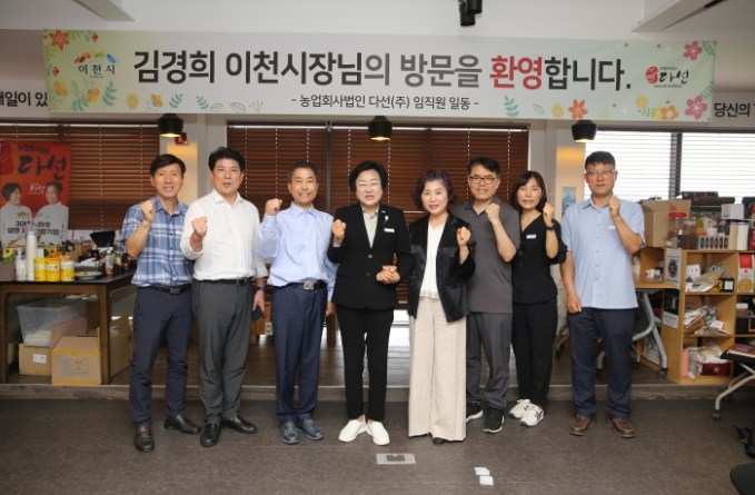 [뉴스노크=김인호 기자] 김경희 이천시장은 7월 8일, 이천시 신둔면 수남리에 있는 식품제조업체 농업회사법인다선(주)를 방문해 기업의 생산 현장을 둘러보고 임직원을 격려하는 자리를 가졌다.