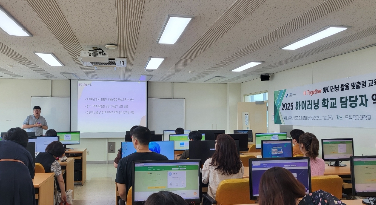 연수 주요 내용은 ▶하이러닝 기능 고도화 ▶하이러닝 관리자 기능 이해 및 수업 설계 ▶AI 서논술형 평가 등이며, 학교 현장에서 적용 가능한 실천․활용 사례 중심으로 구성했다. 특히 이번 연수는 단순한 기능 중심 전달을 넘어, 현장 적용 중심의 실습형 프로그램으로 구성되어 두원공과대학교 산학관 컴퓨터실에서 초등학교, 중학교, 고등학교의 학교 특성과 여건을 고려하여 학교급별로 분반되어 운영됐다.