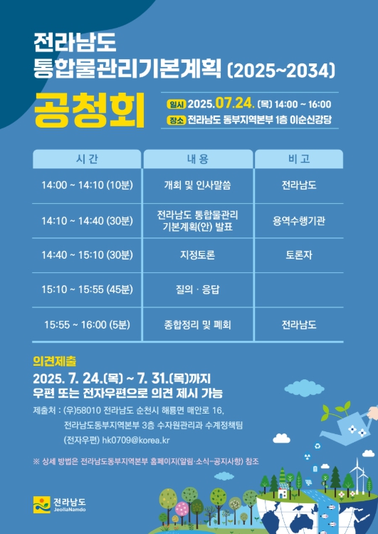 [뉴스노크=김인호 기자] 전라남도는 24일 오후 2시 동부청사 이순신 강당에서 통합물관리 기본계획(안)에 대해 도민, 시군 담당자, 관계 전문가, 이해관계자 등의 의견수렴을 위한 공청회를 개최한다.