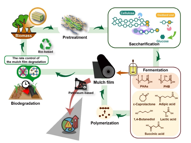 논문에서는 생분해성 멀칭필름의 환경적 중요성과 더불어 ▲바이오매스 전처리 및 당화공정, ▲미생물 세포공장을 활용한 생분해성 플라스틱 단량체 생산 기술, ▲정제 및 중합 공정, ▲멀칭필름 분해 속도 제어 및 기능 향상을 위한 고분자 설계 기술 등을 종합적으로 다뤘다.
